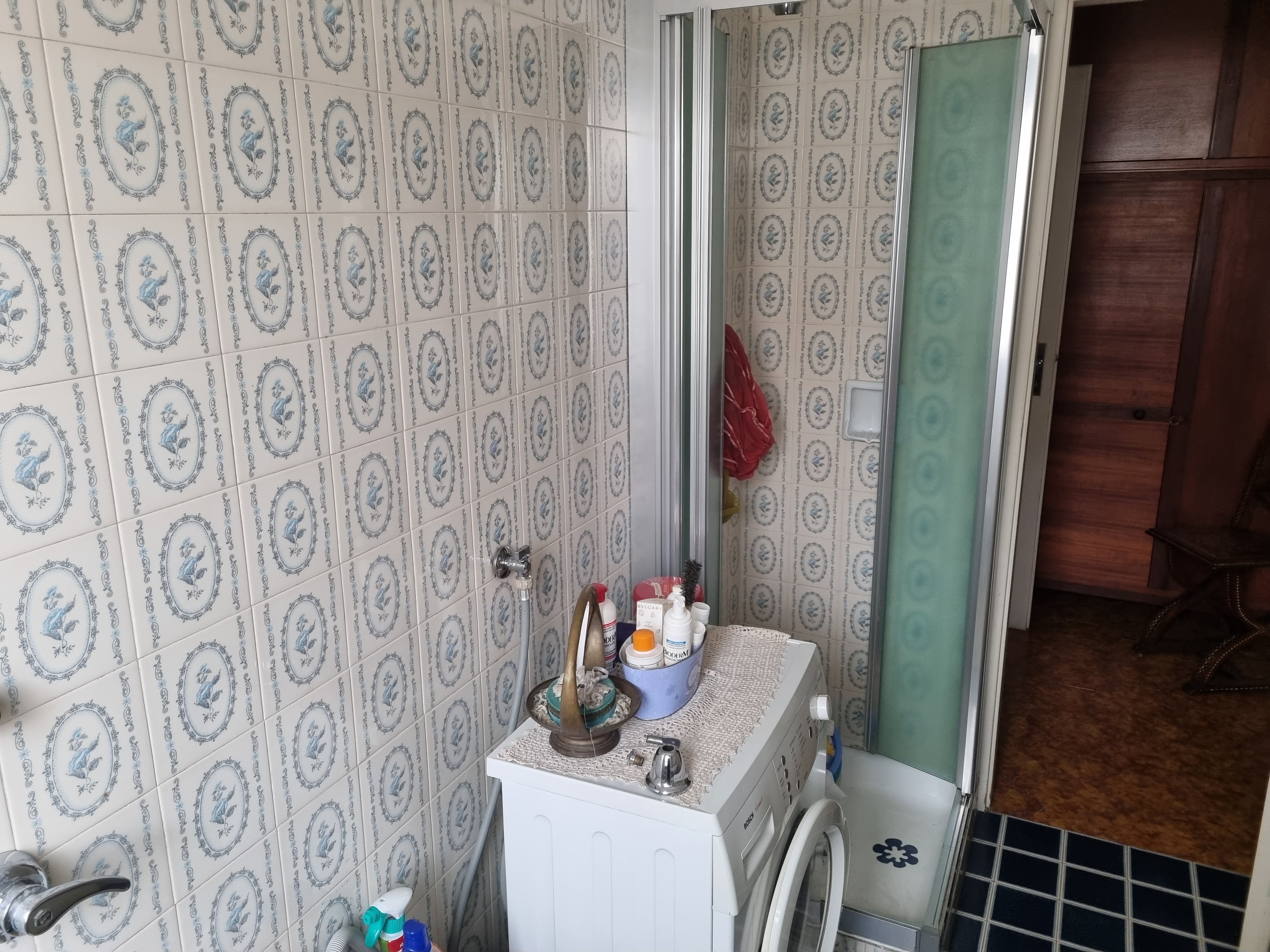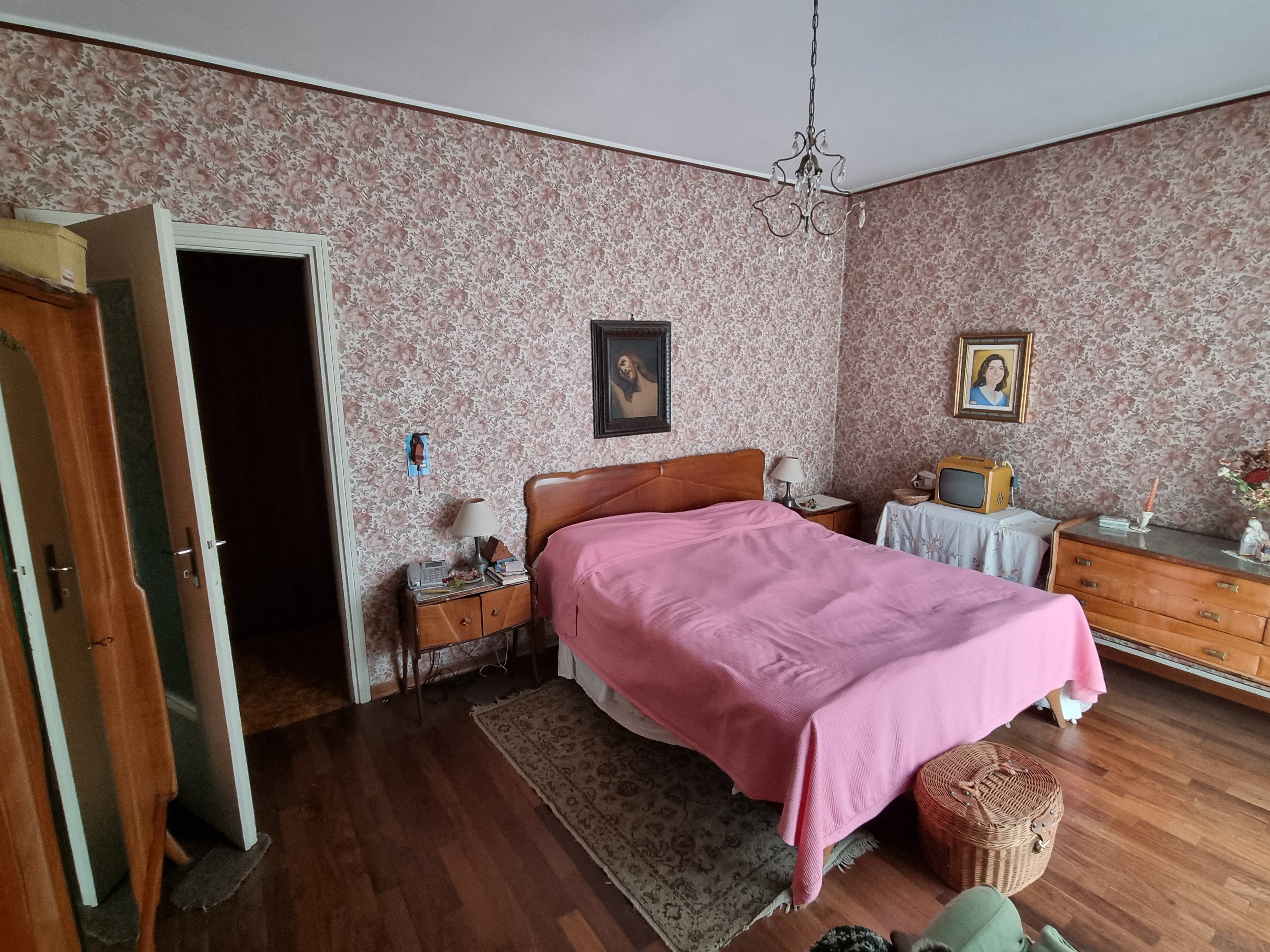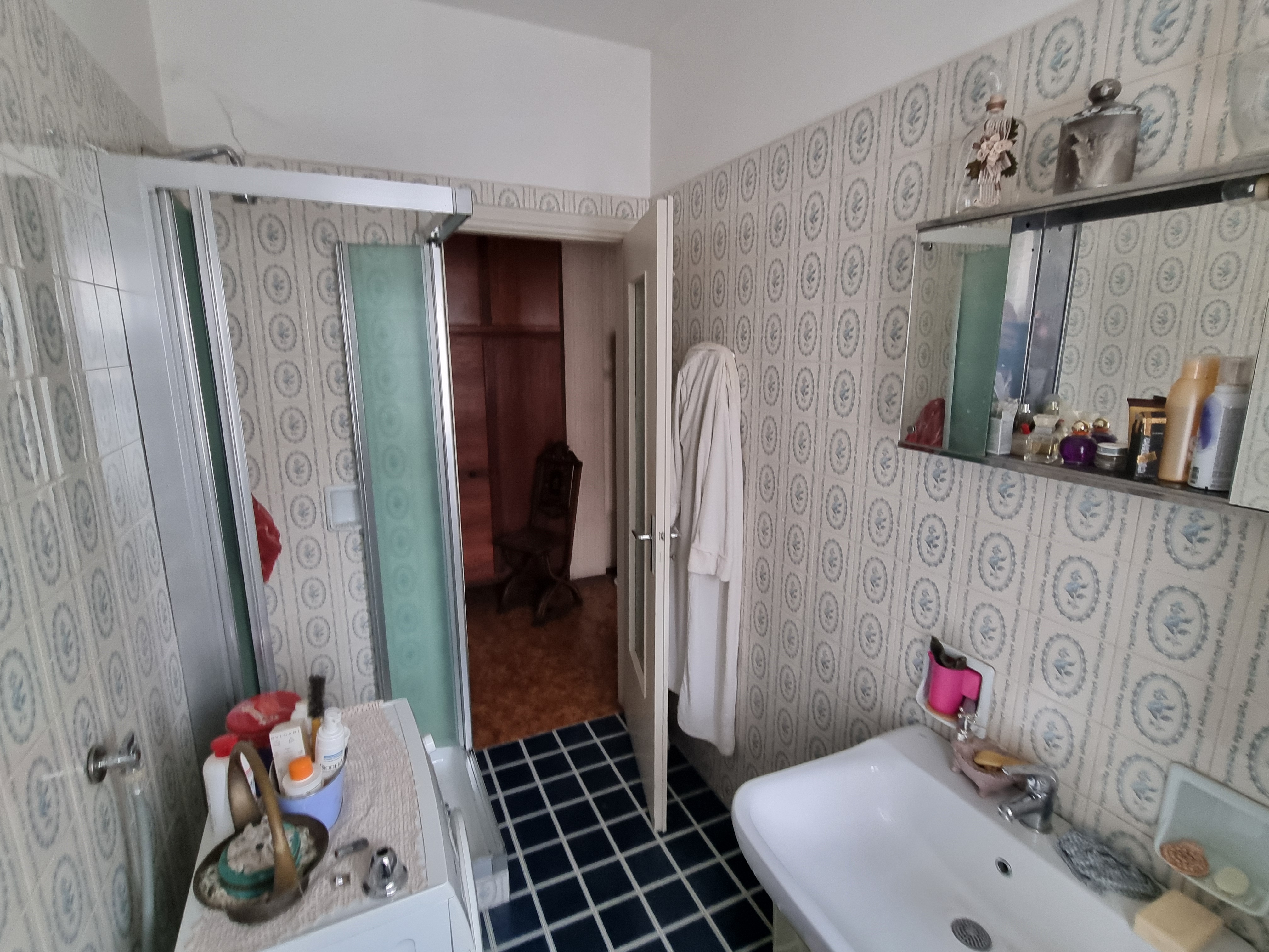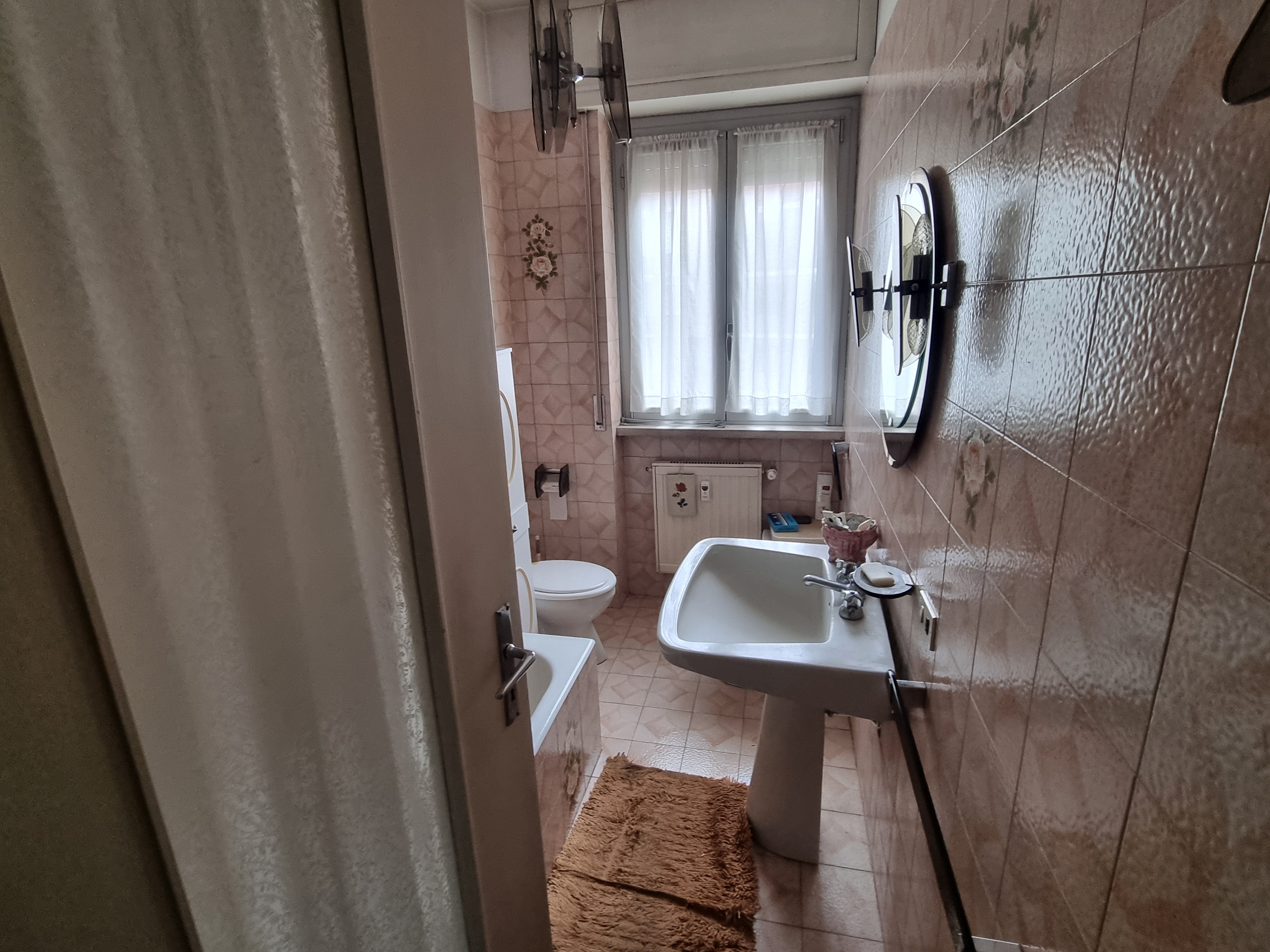 Dal corridoio centrale si accede ai due bagni, entrambi finestrati, uno con la doccia ed uno con la vasca. Nel corridoio è presente anche un’armadiatura. La camera matrimoniale ha anch’essa un balcone che si affaccia sempre verso l’interno del complesso portando a ben 4 il numero dei balconi ed ha un bel pavimento in parquet. La cameretta anch’essa si affaccia come detto, sul balcone in comune con il soggiorno ed anch’essa ha il parquet. A completamento dell’unità immobiliare abbiamo una cantina al piano terra ed un box auto sempre al piano terra.