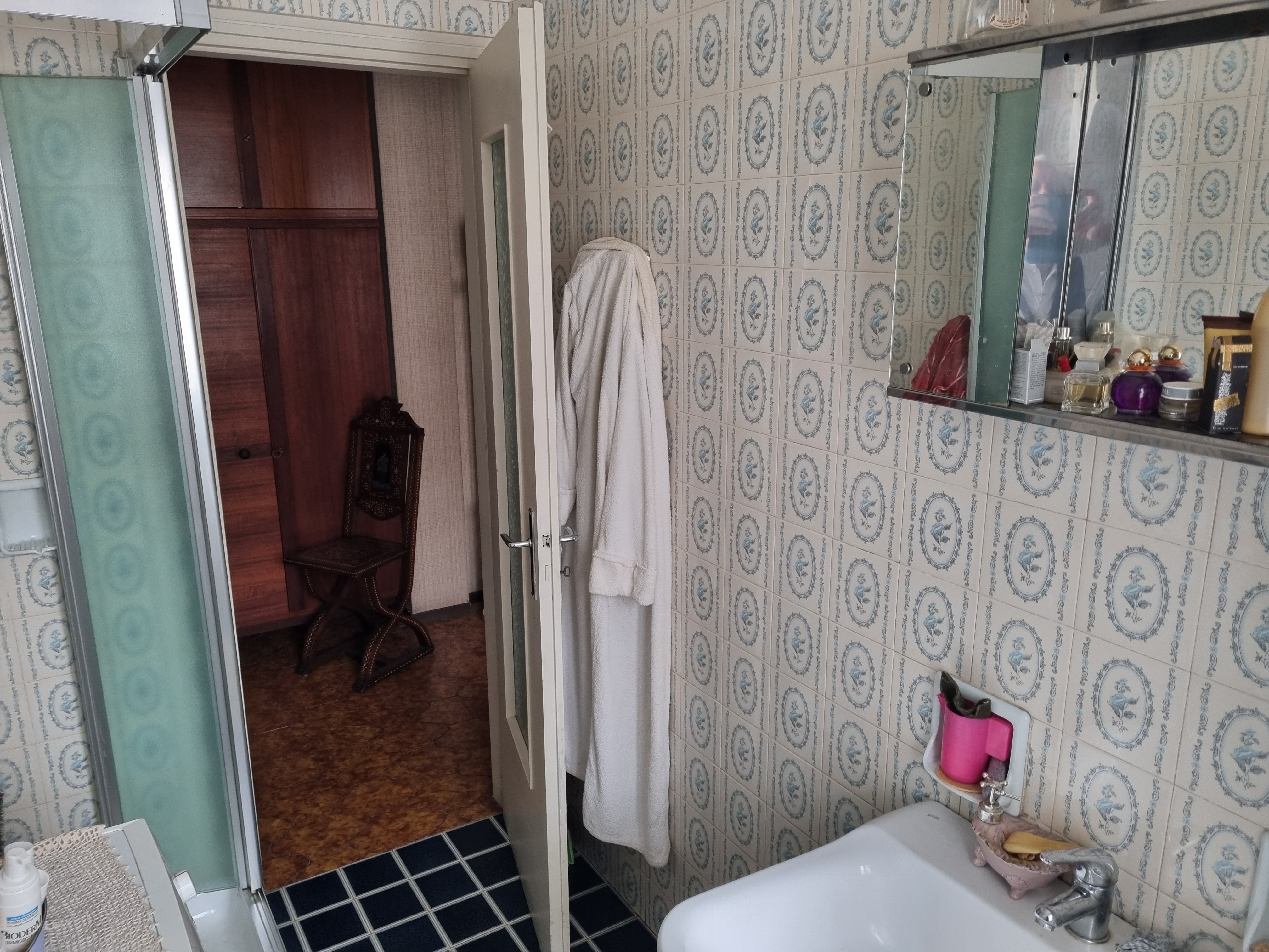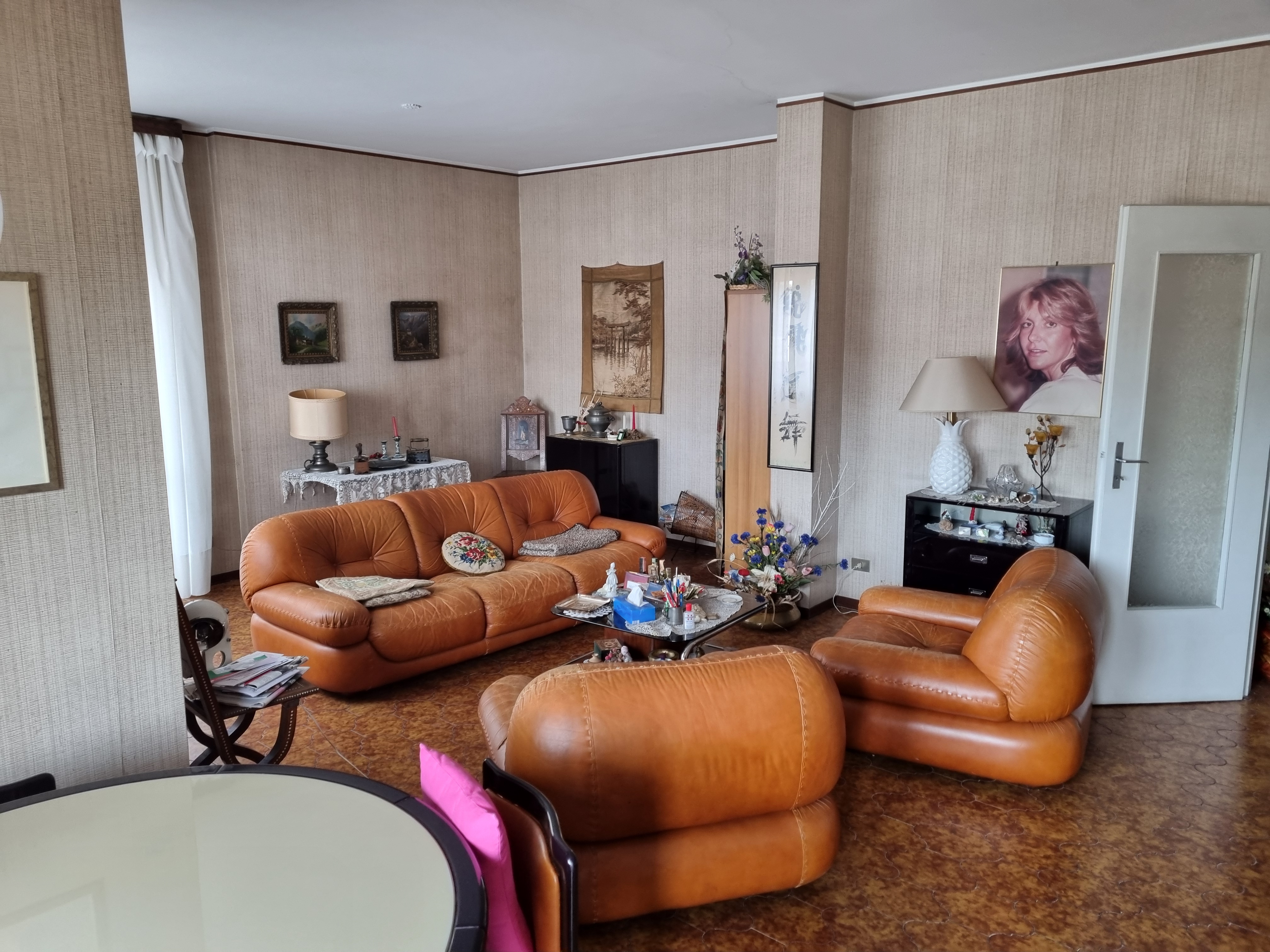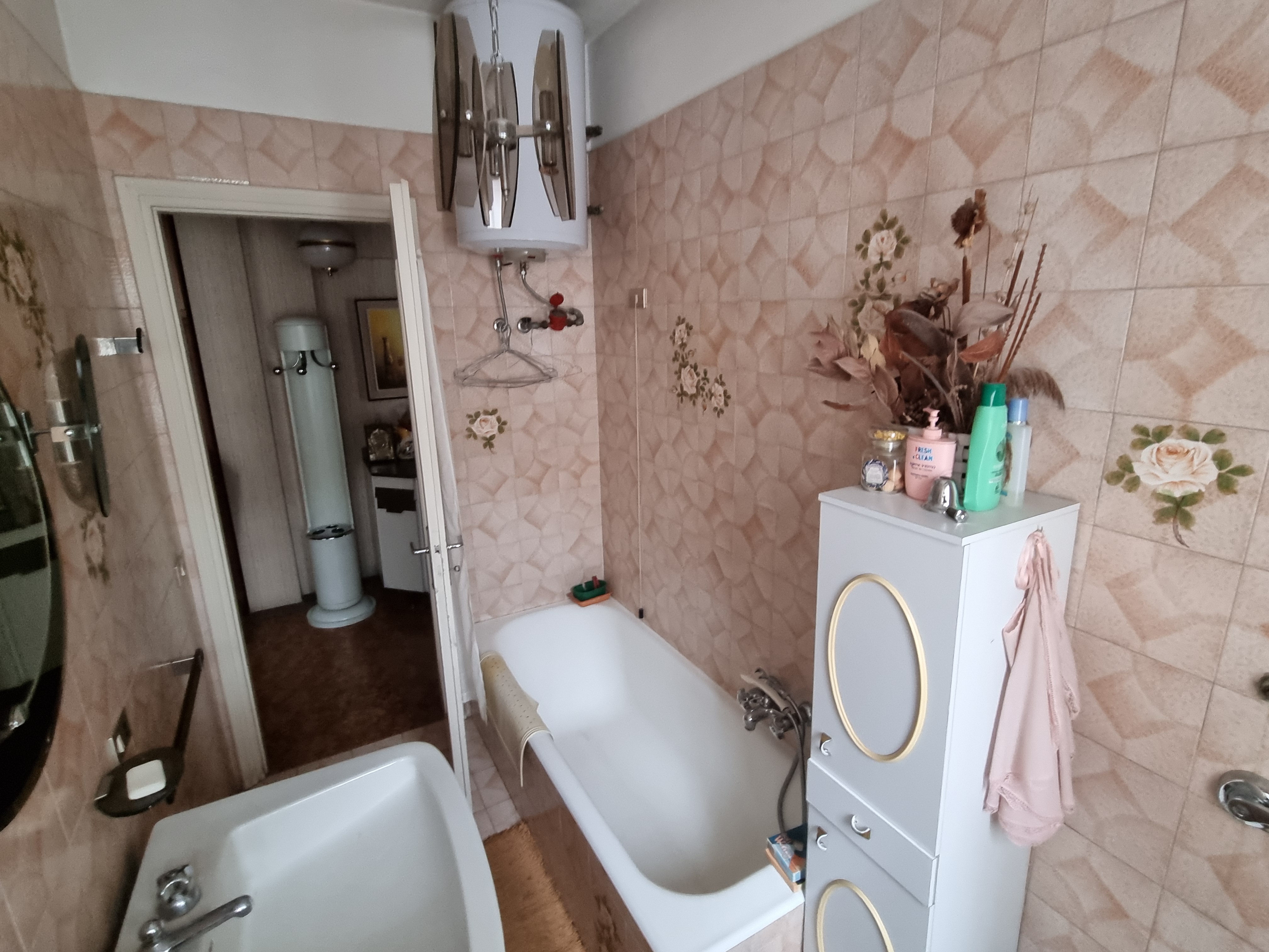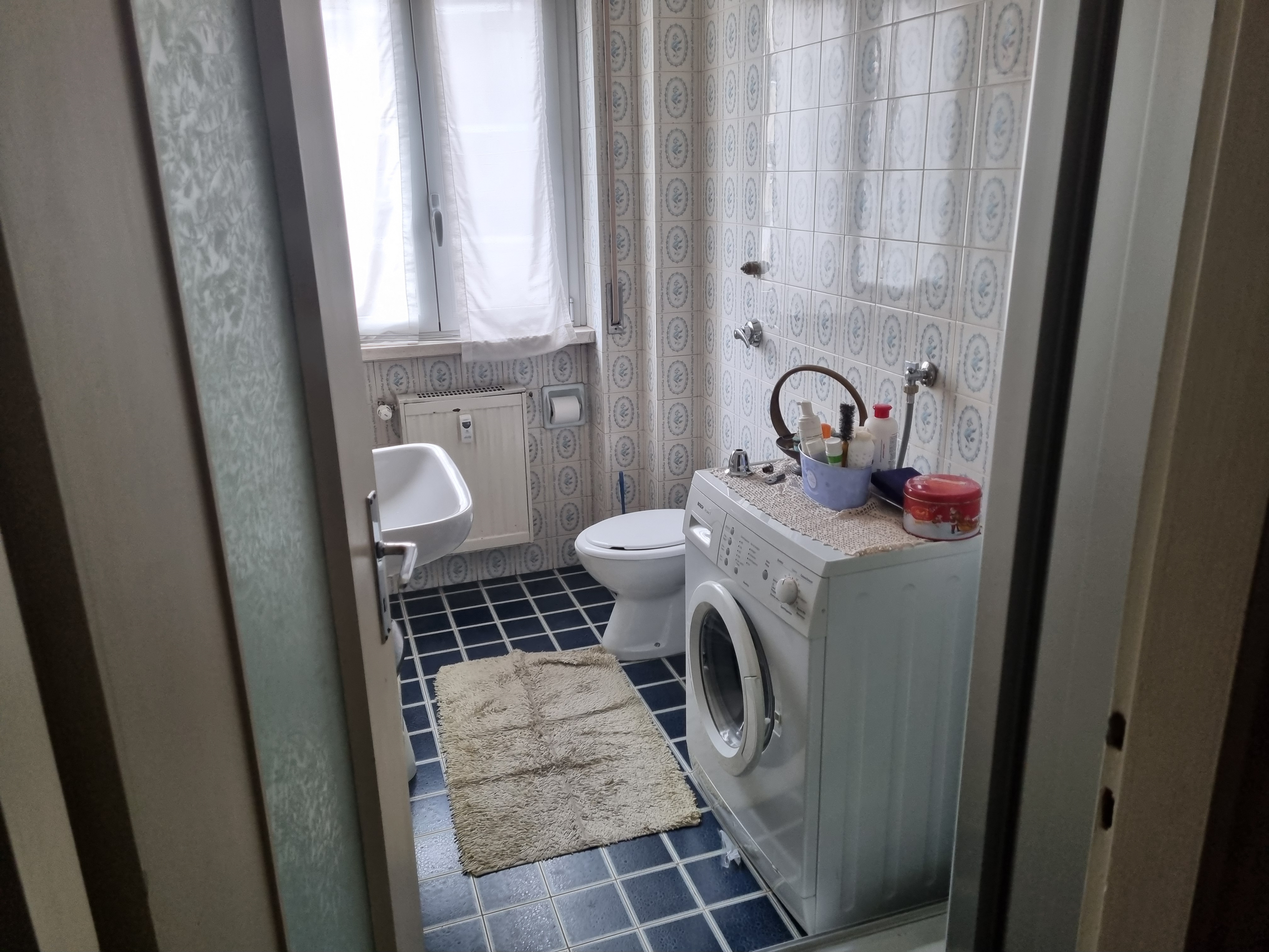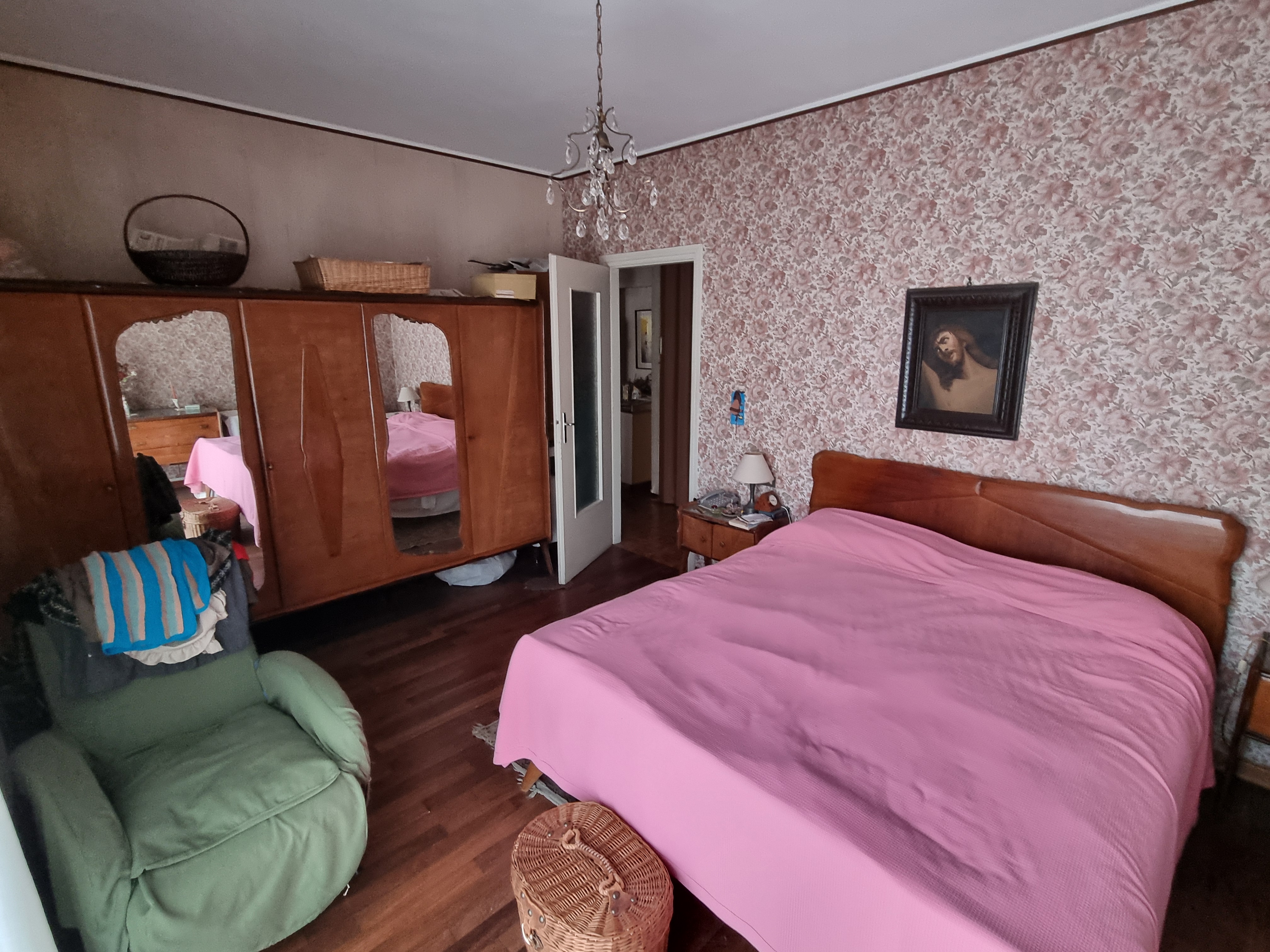 Dal corridoio centrale si accede ai due bagni, entrambi finestrati, uno con la doccia ed uno con la vasca. Nel corridoio è presente anche un’armadiatura. La camera matrimoniale ha anch’essa un balcone che si affaccia sempre verso l’interno del complesso portando a ben 4 il numero dei balconi ed ha un bel pavimento in parquet. La cameretta anch’essa si affaccia come detto, sul balcone in comune con il soggiorno ed anch’essa ha il parquet. A completamento dell’unità immobiliare abbiamo una cantina al piano terra ed un box auto sempre al piano terra.